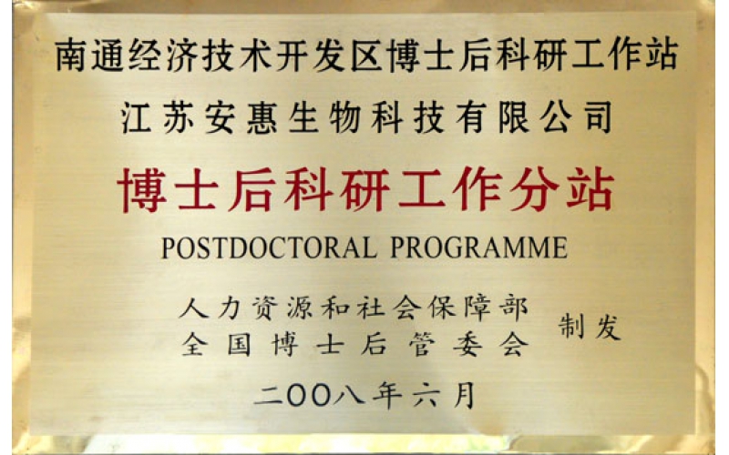 2008年10月15日,安惠公司接受國家人力資源部、社會保障局、全國博士后管委會聯(lián)合制發(fā)的“博士后科研工作分站”銅牌。