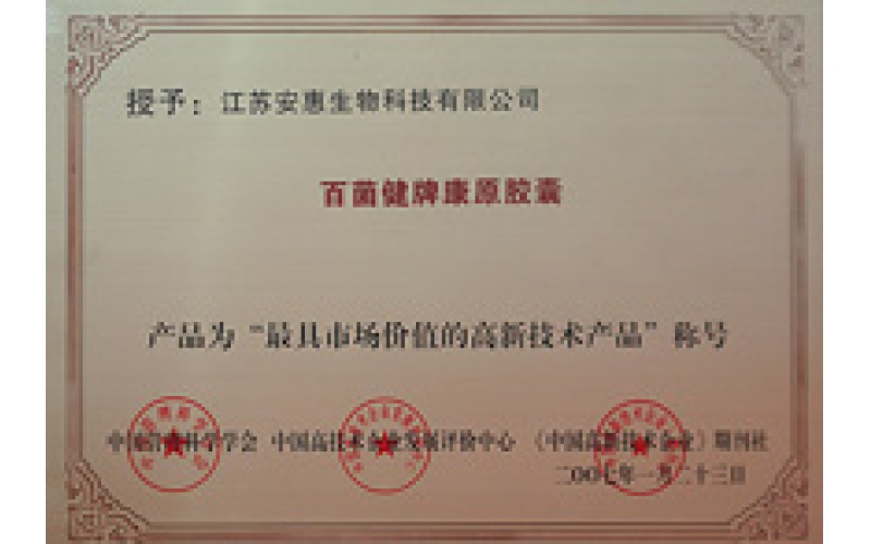 2007年1月24日,安惠百菌健牌康原膠囊產(chǎn)品獲得中國管理科學(xué)學(xué)會、中國高技術(shù)企業(yè)發(fā)展評價中心、中國高新技術(shù)企業(yè)期刊社聯(lián)合評定的“最具市場價值的高新技術(shù)產(chǎn)品”榮譽稱號。同時,百菌健牌康原膠囊還與公司的另一產(chǎn)品——靈芝孢子蟲草菌絲體粉攜手獲得“江蘇省名牌產(chǎn)品”榮譽稱號。