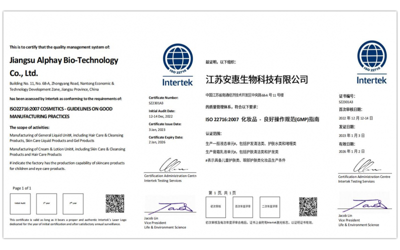 2023年1月,安惠公司化妝品生產系統(tǒng)順利通過認證公司Intertek的嚴格審核,獲得ISO22716質量管理體系認證,即國際化妝品GMP認證。化妝品GMP管理系統(tǒng)的目標是通過對生產流程中的每項工作、每個環(huán)節(jié)和每道工序都進行高標準的規(guī)范和要求,消除和防止產品在制造過程中的質量缺陷,避免化妝品產品對使用者的潛在危險;GMP認證的最大優(yōu)點是證實生產企業(yè)的廠房、人員、設施、材料的采購和使用及產品制造過程控制、工廠和人員衛(wèi)生管理、質量管理體系均達到了世界先進水平。