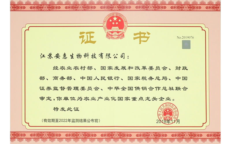 2019年12月,經(jīng)各省(區(qū)、市)遴選推薦、嚴(yán)格把關(guān),專家評(píng)審和全國(guó)農(nóng)業(yè)產(chǎn)業(yè)化聯(lián)席會(huì)議審定,農(nóng)業(yè)農(nóng)村部公布了第六批300家農(nóng)業(yè)產(chǎn)業(yè)化國(guó)家重點(diǎn)龍頭企業(yè)名單,江蘇安惠生物科技有限公司榜上有名。