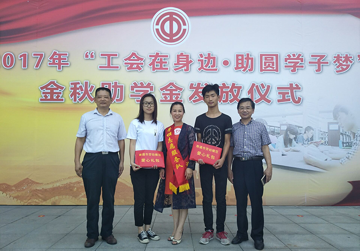 2017年8月24日上午,南通市總工會(huì)組織召開“工會(huì)在身邊 助圓學(xué)子夢”金秋助學(xué)活動(dòng)。安惠公司副董事長陸漢萍出席活動(dòng)。她心系寒門學(xué)子,積極響應(yīng)并加入到勞模志愿服務(wù)隊(duì)伍當(dāng)中,通過安惠愛心基金定向捐助張沙宇、秦玉婷兩位困難職工的子女,圓了他們的上學(xué)夢。她勉勵(lì)兩位學(xué)子努力學(xué)習(xí),學(xué)有所有成,回報(bào)社會(huì);同時(shí)也承諾,安惠人將一如既往地關(guān)注、幫助到他們的成長。